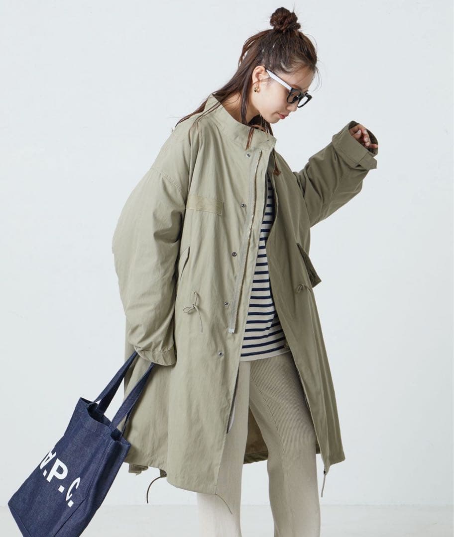 試着のみ。タグ付き新品です。定価 25300円肩幅 60身幅 65着丈 70袖丈 53.5裄丈 85フード付きのモッズブルゾン。軽い素材でゆったりしたシルエットで快適な着心地です。大きなフードで首回りに立体感を十分に出し、深いフードを閉じるとハイネックのようになるデザイン。ダブルジップなので気分で着こなしの雰囲気を変えやすいです。ポケットは大き目のフラップでモノが落ちにくいように折り重なる仕様にしていたり、袖口をタブボタンで袖口の大きさを調整したり、デザイン性だけでなく機能面も充実。アームも大きめでゆったりとしたデザインなので肉感のあるニットやスウェット等も着こんでいたたやすくデイリー使いにピッタリの一枚です。ご覧いただきありがとうございます。肩幅/身幅/袖丈/着丈肩幅···60cm身幅···65cm袖丈···53cm着丈···70cmカラー···グリーン汚れ・破れ・臭いなど···なし